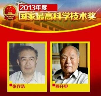 著名物理化学家,中国高能化学激光奠基人、分子反应动力学奠基人之一,中国科学院院士张存浩,著名物理学家,中国核试验科学技术的创建者和领路人,“两弹一星”功勋科学家程开甲院士,共同荣获2013年度国家最高科学技术奖。