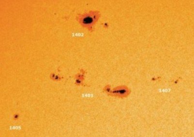 当这类来自太阳的“空间风暴”袭击地球时,它们将引起电子通讯的故障,以及对轨道上运行的人造卫星。如果您的手机在这一天出毛病,请归咎于太阳。我们对太阳活动的空间监控主要来自于美国国家航空航天局太阳动力学天文台(SDO),该空间观测平台清楚地记录了第NOAA 1401与1402太阳黑子活动区在数天前产生的耀斑,由此产生的了日冕物质抛射并“奔向”地球。太阳动力学天文台搭载的一系列空间相机每间隔几秒钟就对太阳表面进行观测拍摄,在成像的过程中,还使用了各种滤光镜。