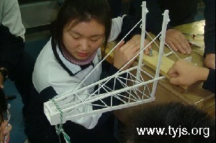 北京四中一名女生正与同伴一起专注地搭建“悬臂梁结构模型”。