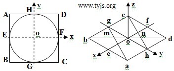 步骤二:在直角坐标中,作圆O的外切正方形,根据AB,CD平行于OY轴,BC,AD平行于OX轴,在轴测坐标中,求得正方形ABCD的轴测投影为abcd。