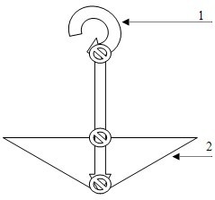 由附图1可知,本实用新型由衣架主体和悬挂部件组成,其中衣架主体由一个金属铁丝等腰三角形形态的构件形成衣物放置器2,悬挂部件由金属铁丝的挂钩和挂杆组成衣架悬挂器1,衣架的主体等腰三角形的底边中心点和等腰三角形的顶角点均与悬挂部件的挂杆一端相嵌固定,挂杆的另一端与挂钩一端相嵌固定。